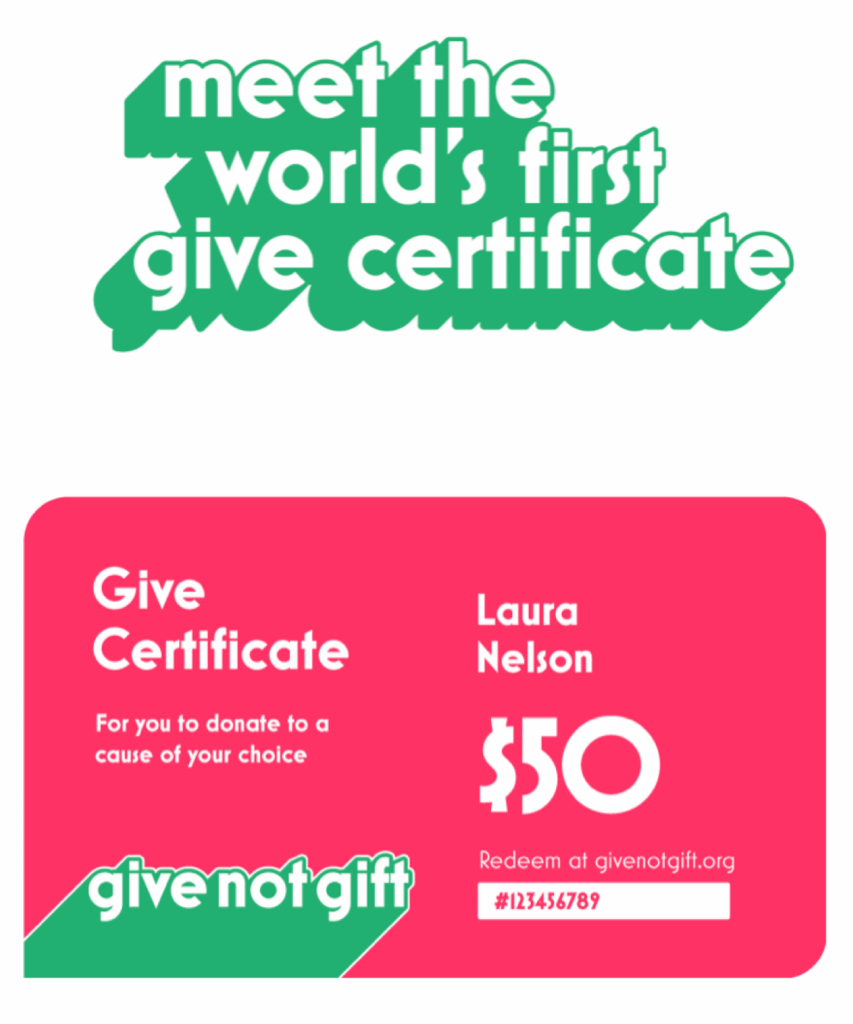 Real talk. Giving a present is hard. Who even knows if Jerry will like that spice rack? But instead of tossing money into a commercialized vortex, now you’ve got the world’s first Give Certificate in hand. A way to let your loved one go shopping for a good cause, all, while you foot the bill. Finally, a gift you know will be treasured by your friend and whichever charity she chooses.